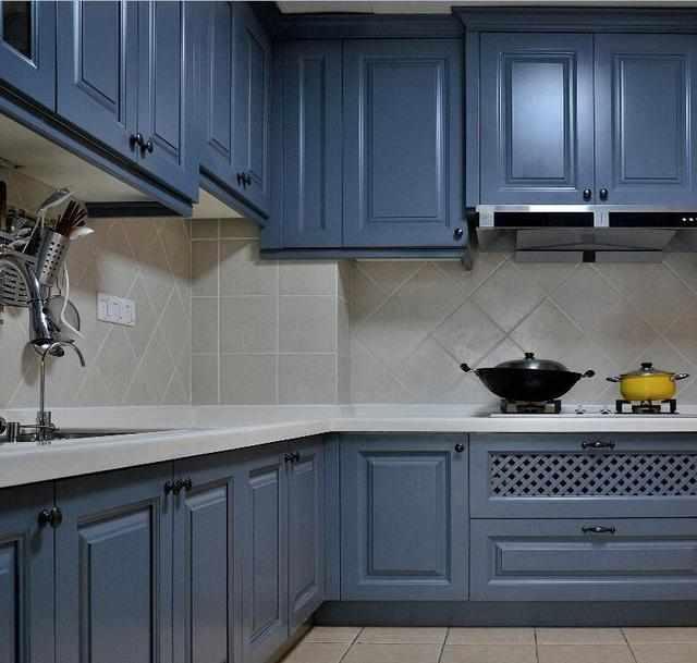 廚房的話,考慮到米白色不耐臟,所以選擇了藍(lán)色,這個(gè)顏色也是很沉靜顯氣質(zhì)的顏色。幸虧當(dāng)初老婆堅(jiān)持,櫥柜上面都打了吊柜。現(xiàn)在家里東西都收納的井井有條。