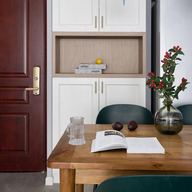 玄關(guān)入戶的空間打造一面柜子,這是可以儲(chǔ)物柜設(shè)計(jì)的很簡(jiǎn)易卻很實(shí)用,同時(shí)搭配擺放休閑的餐桌椅組合,花瓶的擺放點(diǎn)綴讓餐廳也更小清新,這樣的餐廳雖然空間小,但是可以滿足四個(gè)人用餐也是十分的富有格調(diào)。