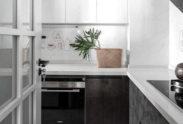 廚房的面積雖然不大,但布置得緊湊而實用。白色墻面、吊柜搭配黑色櫥柜,非常簡約大方。這里的櫥柜呈L型布局,將轉角空間充分的利用起來,平時操作起來也更加方便順手。