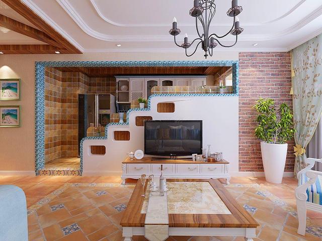 當然了,電視墻還有很多種的創意設計,像下面的這個案例中,整體的裝飾風格是地中海風格,同時又是一個樓梯的部分,那么在設計電視墻的時候,就有一種階梯的感覺,和客廳的風格也比較搭配。
