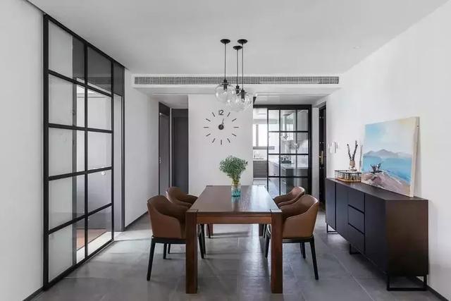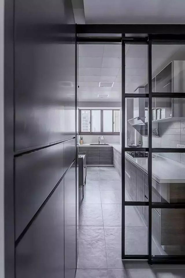 整個家采用的都是灰色調,廚房當然也不能例外,木質柜體搭配深色地板、玻璃門,再容易臟亂的廚房都不易臟。