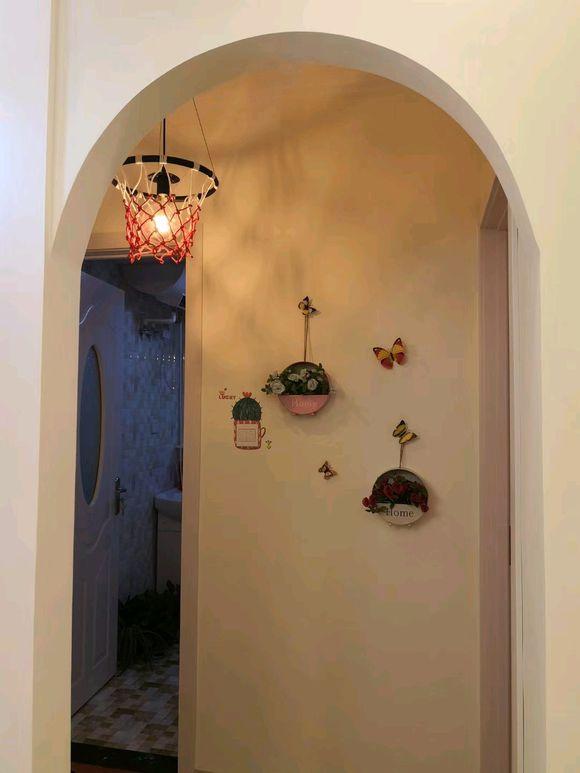 在鞋柜這邊是衛生間,從門看過去燈飾是很特別復古的樣式,挑選了好久的呢,打造一種復古天然大自然的感覺。墻面的裝飾都是特別舊。