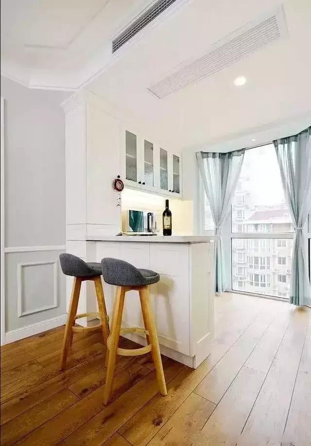 做門的一角說完了,那就來說說不做門的陽臺該怎么布置吧,比如給它做一個吧臺作為隔斷,然后把陽臺打造出一個休閑與實用兼備的空間。