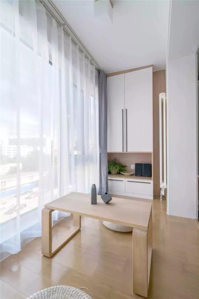 也可以把客廳和陽臺完全給連通,陽臺的一側做和墻體齊平的柜子,增強收納能力,空余的地方擺放懶人沙發、休閑桌椅等等。
