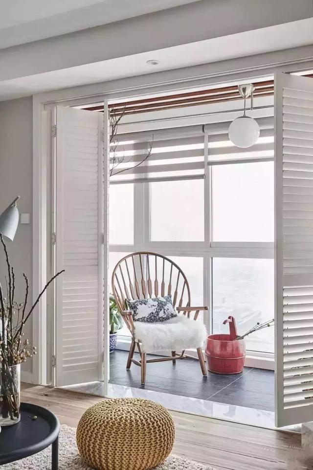 大部分屋主會選擇給陽臺和客廳之間加上門,但普通的玻璃推拉門就沒有這樣的折疊百葉門好看,折疊百葉門不搭配窗簾也能保證隱私性。