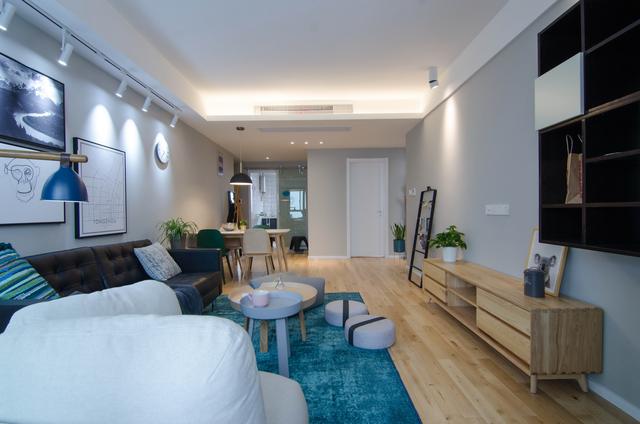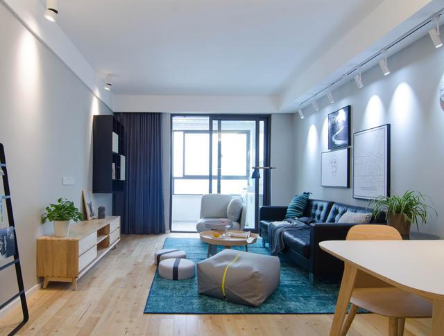 換一個角度看,其實都是簡簡單單的簡約型家具,這么一組合,效果還真不賴,黑色的皮質沙發,馬卡龍色的小茶幾,藍色的地毯很跳躍,給客廳整體色調加了不少分,電視柜是原木風的,和地板很搭調。