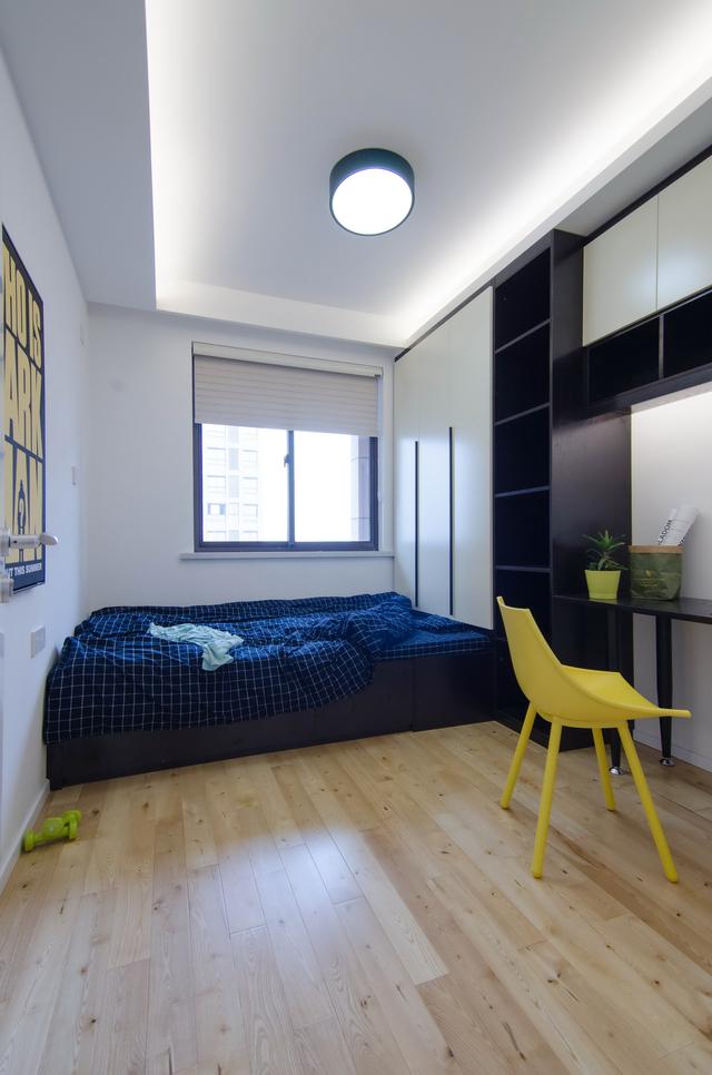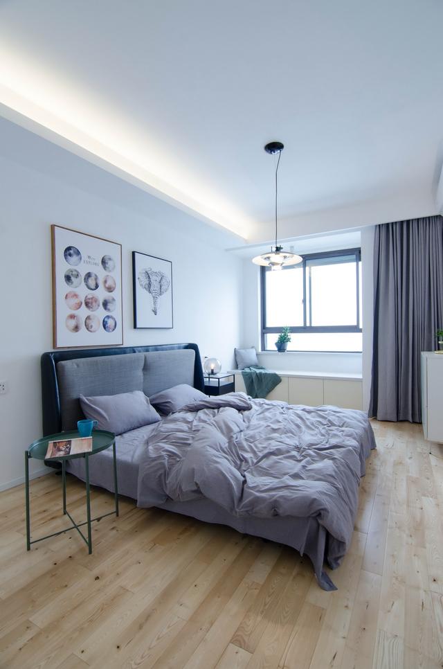 主臥很寬敞,飄窗還打了柜子,用造型輕便的小桌替代傳統床頭柜,有亮點且個性時尚。