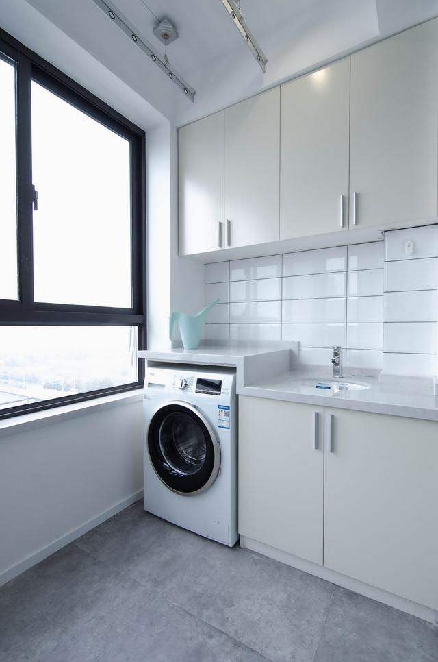 陽臺空間不小,把洗衣機直接嵌入了定制柜內,洗手臺、收納柜一應俱全。
