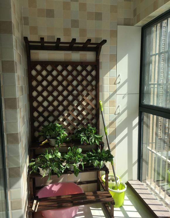 陽臺部分一邊是花架一邊是洗衣柜和吊柜,實用性美觀性都兼具了。