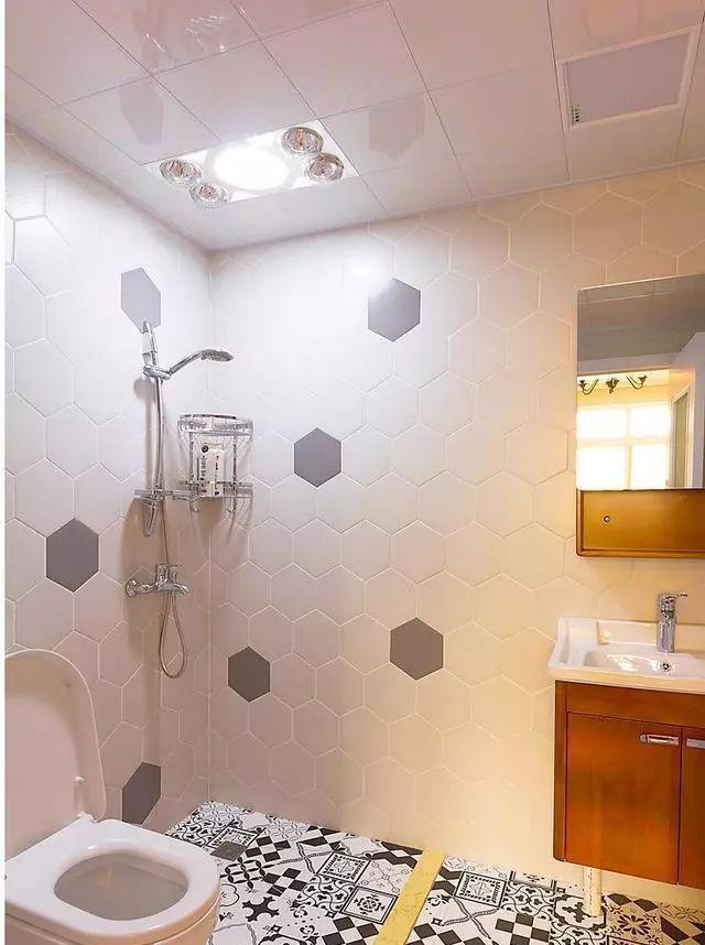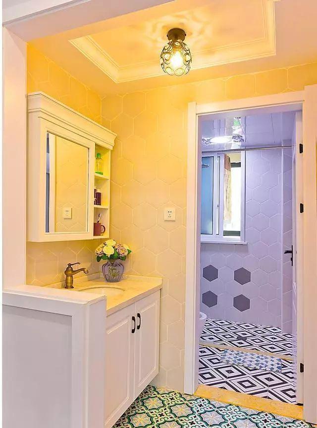 衛生間把洗手臺裝在了外面,地面花磚圖案不一也體現了區域的劃分。