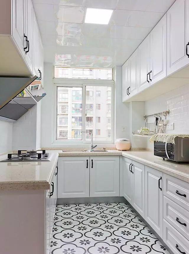 廚房地面是黑白花磚,大面積的白色就適合一些比較有亮點的搭配融入其中,加上窗戶透過來的光線,干凈敞亮。