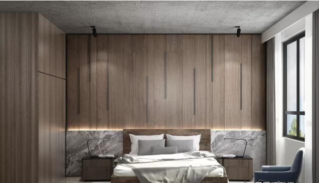 主臥的背景上半部分用了和餐廳相同材質-淡雅原木色系的木飾面,搭配簡單利落的黑色線條,墻裙用富有肌理感的大理石裝飾提升空間氣質。無需過多裝飾,剛與柔,冷與暖碰撞出一個極簡輕奢舒適空間。