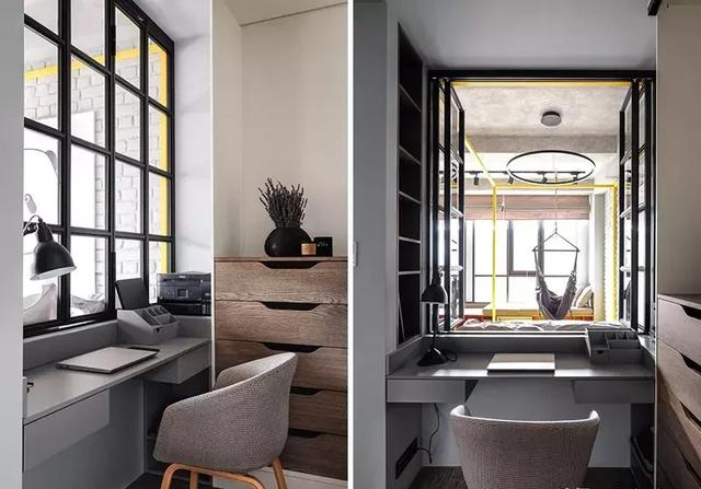 ▲雖然面積不大,設計師依舊為屋主規(guī)劃了私人的工作區(qū),以金屬的開窗作為空間劃分的界限,保證獨立性也保證了采光與通透性。