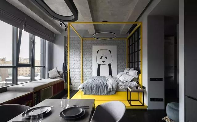 ▲設計師將臥室定義為開放又獨立的趣味空間,無任何隔墻遮擋,與外部相連,這是開放的,同時巧妙地通過灰色的磚塊、檸檬黃的金屬框架、大幅的熊貓藝術品,巧妙的劃分著區(qū)域。