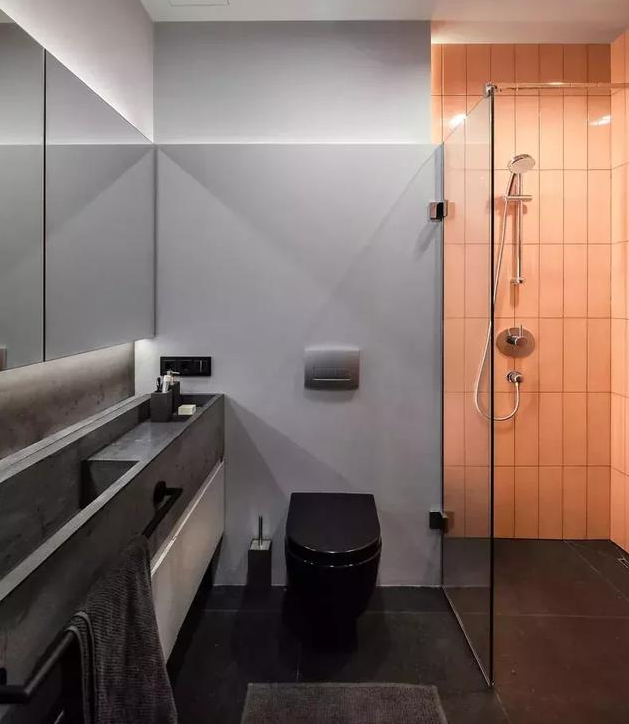 ▲小巧的洗浴室布局合理,設計師依舊選用了混凝土與灰色調的搭配裝修,不僅硬朗,也潔凈利落。