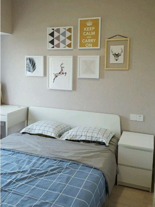 主臥風格和客廳保持一致,淺灰色的雙人大床搭配幾何圖形的床品,床頭上方兩幅卡通畫裝飾墻面。