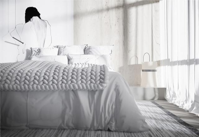 臥室里的裝飾是空靈的。一張全白的床,一張小地毯和一面有特色的墻構(gòu)成了一個(gè)干凈而寧?kù)o的空間。