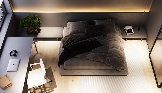 在一間灰色的臥室里,LED燈發(fā)出的溫暖光芒將床頭墻一分為二。臥室的燈光營(yíng)造出寧?kù)o的氛圍。