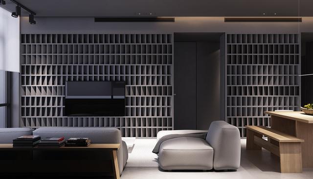 由數(shù)百個(gè)壁龕組成的網(wǎng)格構(gòu)成了電視墻的裝飾和餐廳旁邊的特色墻。意境照明創(chuàng)造有趣的光和陰影在安裝。