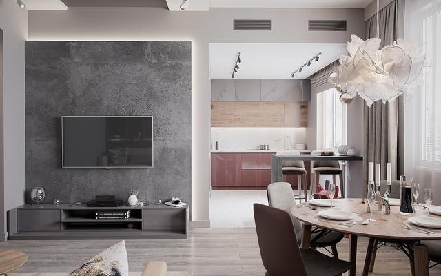 原始的混凝土電視墻裝飾有助于平衡粉紅色調(diào)的甜味。墻上安裝的電視下方有一個(gè)灰色的控制臺(tái),與背景融為一體。