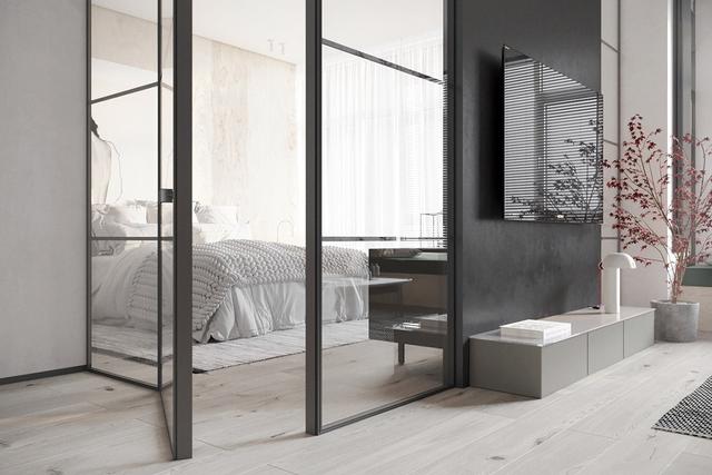玻璃墻的臥室允許暢通的視覺流動(dòng),并在緊湊的生活區(qū)最大化的空間感。