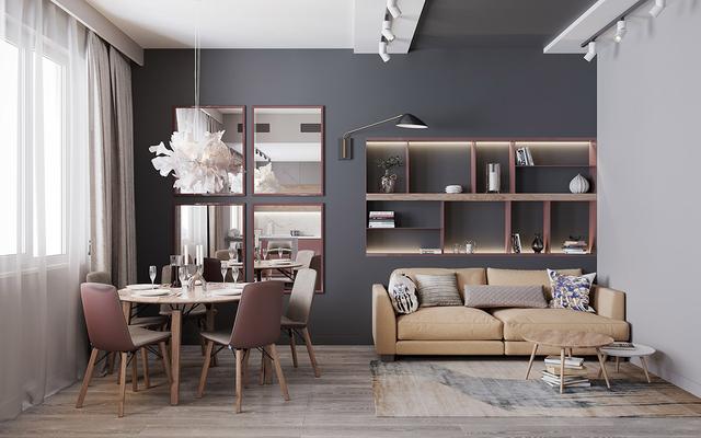 這個(gè)客廳餐廳組合說明了如何使用一個(gè)聲明的顏色在灰色背景下,而不是壓倒它。這種暗粉色傾向于與灰色調(diào)和,而不是相互抵消。