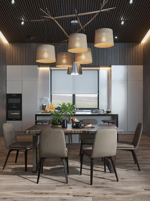 現(xiàn)代化的灰色廚房單元在墻的中央停了下來,那里有一扇大窗戶,可以看到起伏的綠地。燈罩懸掛在樹枝上,做成了這個(gè)質(zhì)樸的枝形吊燈。黑色餐具與桌子厚重的鄉(xiāng)村韻味很相配。黑色餐具與桌子厚重的鄉(xiāng)村韻味很相配。
