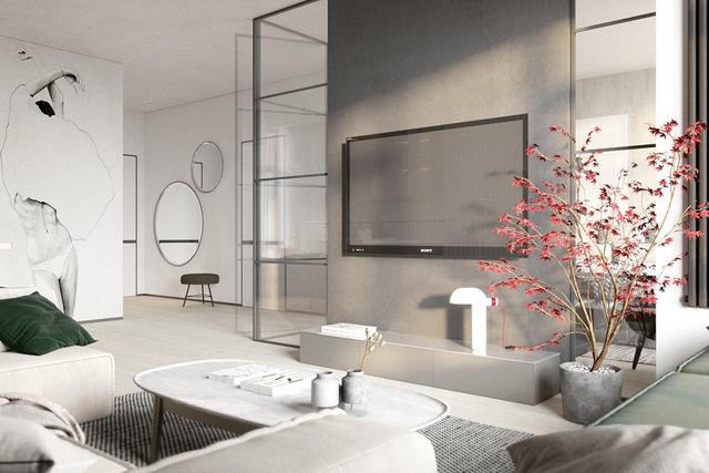 一個(gè)低矮的灰色控制臺(tái)裝置安裝在電視墻上,電視墻將客廳和臥室分隔開來。