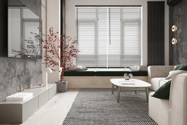 綠色的靠墊為這個(gè)灰色的客廳增添了一些意想不到的色彩。