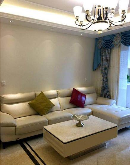 再來看看客廳家具,米黃色皮質沙發與客廳地面通鋪的淺色瓷磚顏色相近,整個沙發區域從墻面到地面都是淺色,看上去整體統一,效果很自然!沙發面前的茶幾造型蠻別致的,上下區分的設計很有層次感,寬敞的臺面也方便儲物,一舉多得!客廳和外面的陽臺沒有設計隔斷,拉通設計后敞亮又通透,整個空間看上去寬敞了不少。