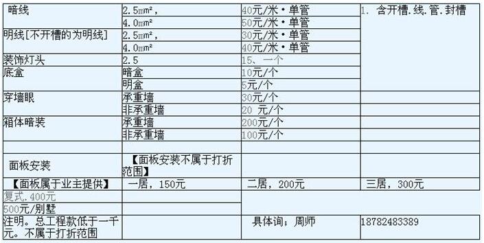1.以上報價含墻面標準開槽.封槽.線.優質PVC管..施工費.及所施工路段五年免費維護。