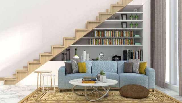 小戶型的房子空間比較小,每一寸空間都值得珍視。圖中就是一個小戶型樓梯間,房主人對這一空間的利用非常的充分。主人在樓梯下面的墻面上打造了白色的書架,地面上則擺放了舒適的坐墊和靠墊,一個小小的書屋就打造出來了。