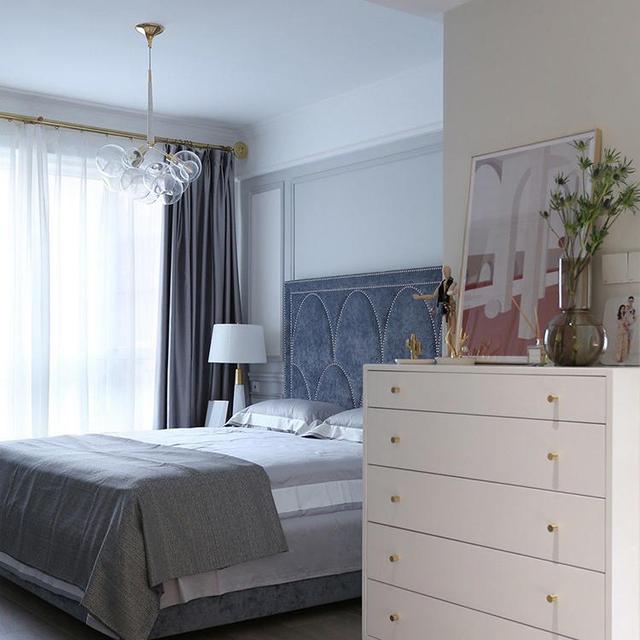 ??臥室也充滿了夢幻般的風(fēng)格。主臥室的空間是夢幻般的床。藍(lán)灰色的墻壁看起來非常漂亮。這是一個可以用作抽屜的白色儲物柜。大容量存儲,頂部的裝飾也很個性,充滿了小浪漫的風(fēng)格。