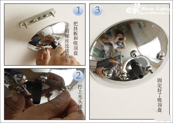 把掛板和吸頂盤用螺絲連起來→擰好螺絲→固定好吸頂盤