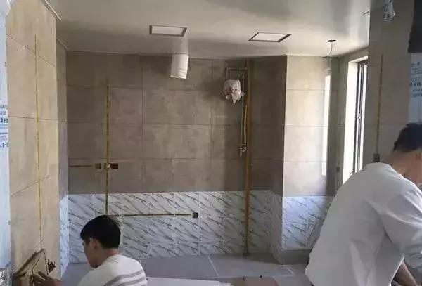 瓷磚都已經貼好了,大家看到有兩種不同的磚,安裝櫥柜的位置,用的是普通瓷磚,反正櫥柜會遮擋住,不影響美觀。