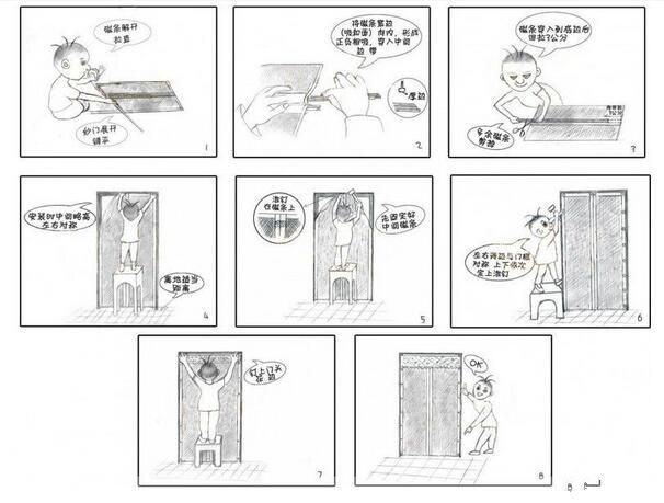 3、安裝穿好磁條的紗片到門框上。找出門的中點。主要注意:安裝時讓紗門與地面重疊一厘米,磁扣不能挨地、中間稍高(先平行安裝,然后再把中間提高1厘米左右,不用擔心紗門會斜,因為有門簾的遮擋,我們可以試想一下,即使沒有磁條,中間提高后,兩片紗門就會自然向心性靠攏)、不要向兩邊掙的太緊,只要安裝方法正確,每個紗門都可以實現輕松自然的閉合的!安裝時,先不要把圖釘或者雙面膠按緊,把紗門先固定上面中間和上面的兩個角,中間和下面的邊各稍微固定,中間進出看閉合的效果,進出后紗門能夠輕松自然閉合,再牢固固定就可以了。如果出現磁條的平面不是對吸的側在一邊吸住的,就可能是磁條的正負極反了。