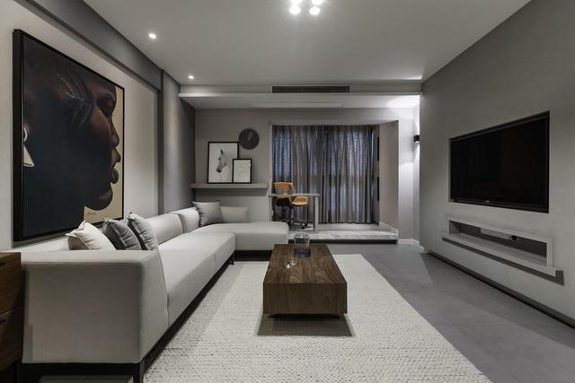 灰色水泥質(zhì)感地面奠定了一份現(xiàn)代氣息,天花板上無主燈的照明裝置更是干凈簡(jiǎn)潔。