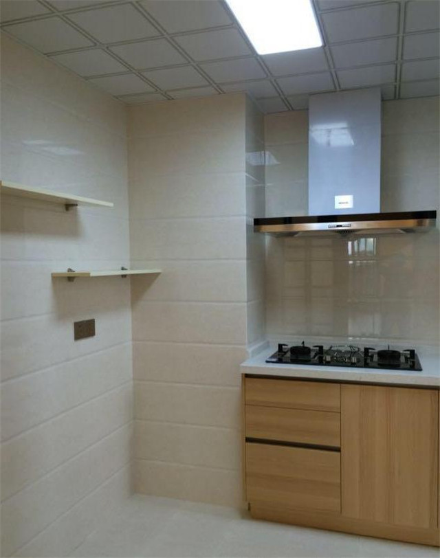 廚房的櫥柜顏色也是選擇的原木色,同時我們在買櫥柜的時候就直接買的多功能型的櫥柜,方便以后的生活。同時在墻壁上增加了幾個置物架,可以放一些干貨,增加一些收納能力。