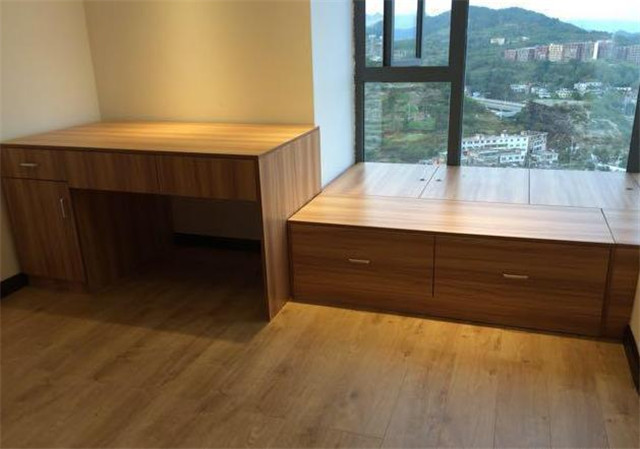 這是其中的一間臥室,我們把飄窗直接打掉了,然后利用凸出去的部分做了一個榻榻米,榻榻米的面積不大。但是平時在這上面休閑活動還是夠用了。同時還能增加一點房間的收納能力。加上旁邊的書桌,這樣一個房間的基本功能就實現了。