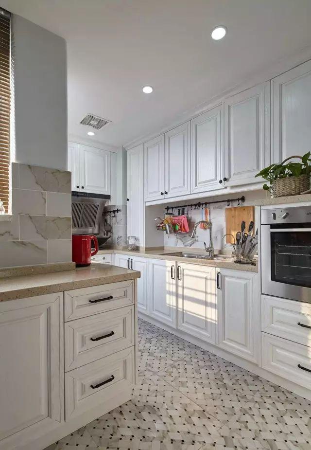轉(zhuǎn)角式設(shè)計(jì)增加了廚房的收納空間,同時擴(kuò)展了操作臺的面積。 在大面積的純白色的柜體中,設(shè)計(jì)師以俏皮又不失質(zhì)感的小瓷??磚和輕石英石臺面裝飾了視覺空間,同時最大限度地引入自然光并將光線融入空間色彩調(diào)節(jié)。
