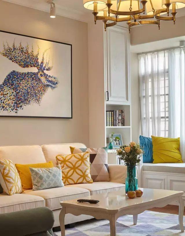 從一束鮮花,三個兩個檸檬黃色和淺藍(lán)色枕頭,一個掛在沙發(fā)墻上的彩色麋鹿,整個空間色彩設(shè)計(jì)的非常的好,提高了不少的裝飾效果。