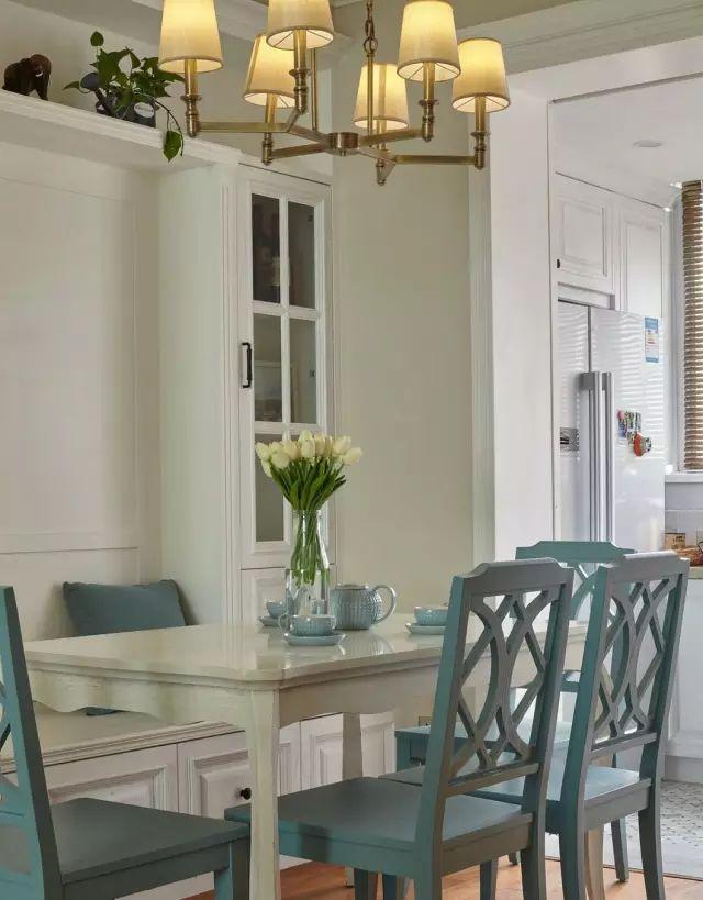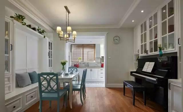 餐廳墻面的裝修設(shè)計(jì)一個卡座,不占空間的恩同事還美觀大方。并在卡座兩邊設(shè)計(jì)了一個收納柜,形成一體式設(shè)計(jì)。