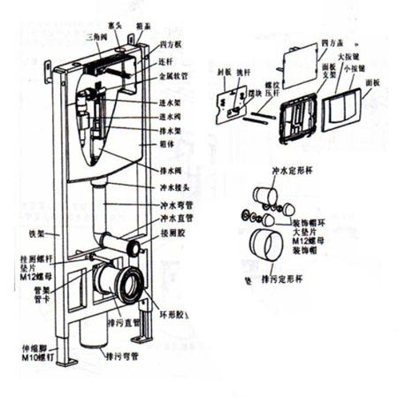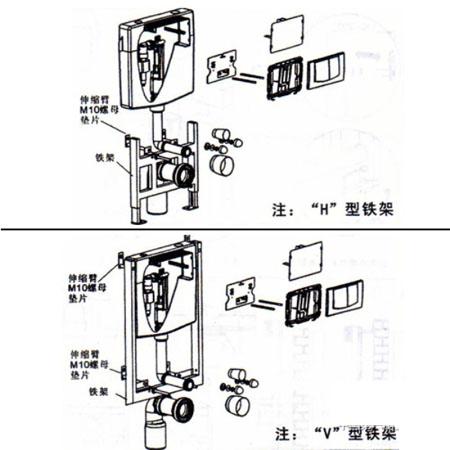 2、 入墻式馬桶支架一般有兩種,一種是“H”形鐵架,一種是“V”形鐵架,在裝法上是有區別的。