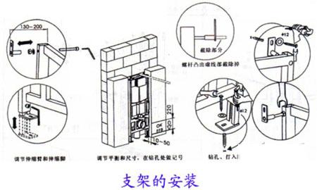 1、 認識入墻式馬桶的安裝支架,整個掛廁將由這個支架來支撐。支架安裝一定要在鋪墻磚之前。在安裝之前,先確認安裝的位置,在安裝墻上劃出地平線,以此作為安裝高度的基準線。