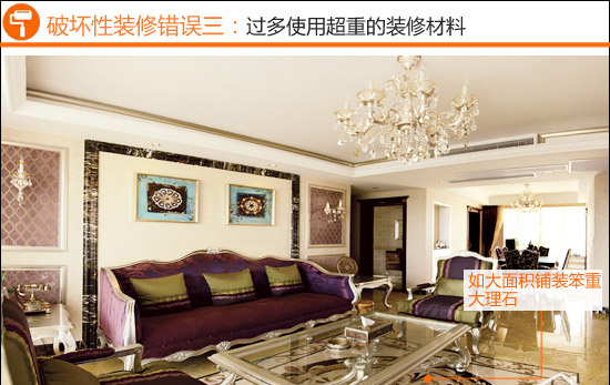 錯誤后果:家庭裝修中,大面積鋪設大理石、用磚砌內墻和做結構復雜的吊頂等有時需要大量使用超重材料,可能會使房屋的承重超過設計標準,導致樓房傾斜和下沉。