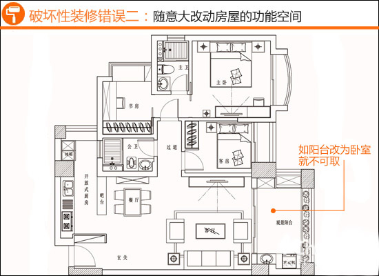 正確做法:需要經過嚴密的可行性審查之后,才可變動房屋原本的功能空間。