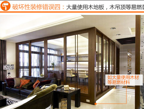 錯誤后果:在裝修中,大量采用易燃不防火的裝飾材料。如木地板,木墻裙,木吊頂,塑料制品,壁紙,墻布,地毯等,當這些材料被卷入火災會助長火勢蔓延和擴展,造成生命安全和財產損失。