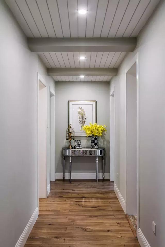 從客廳到臥室的過道盡頭,一組簡美樣式的端景展臺,搭配留白為主的裝飾畫,銀色和香檳色構成視覺的主體色,黑白相框和花瓶讓展臺變得時尚摩登。