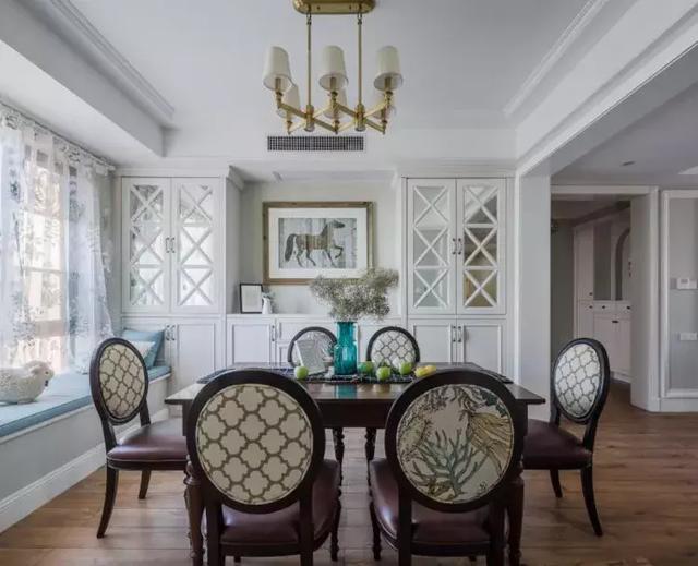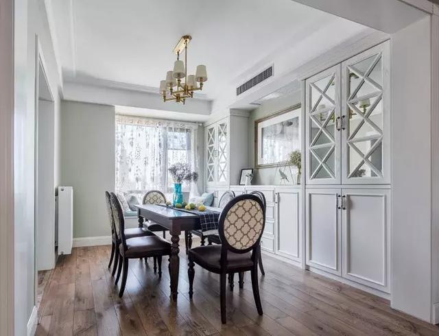 餐廳空間較大,墻面空間被充分利用,設計了裝飾酒柜。柜體造型也做了裝飾性的構思,實用與顏值并存。
