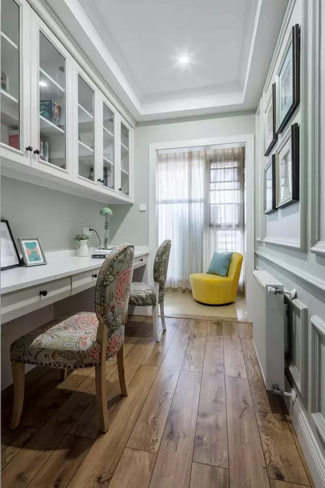 書房空間狹長,采用靠墻設計整排的書桌,在安靜的環(huán)境里享受閱讀的樂趣,在暖黃的休閑椅上休息,舒適而自在的享受著生活的每個細節(jié)。